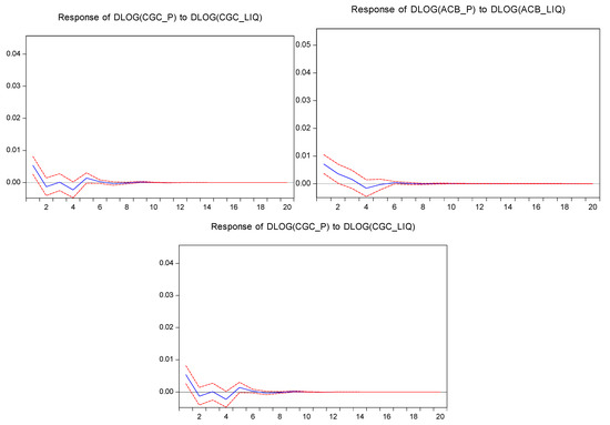 in which, Yt is the vector containing vectors y of variables of the system (i.e., stock returns, liquidity and Google Trends indicator) and εt is the innovation vector. The optimal lag length is one under Schwarz and Hannan–Quinn information criteria. The impulse response function is calculated based on the MA(∞) representation of the VAR model as follows: