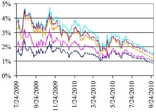 AAA credit spreads in percent for five vintages of the CMBX index plotted from 24 July 2009, to 30 September 2010. The figure plots the credit spreads in percent implied by various vintages of the CMBX AAA indexes owned by Markit. The figure plots the credit spreads from the date of the first Term Asset-Backed Securities Loan Facility (TALF) sponsored purchase of Commercial Mortgage-backed Securities (CMBS) on 24 July 2009, until 30 September 2010. These are the rates that a credit protection buyer, credit default swap (CDS) buyer, must pay to insure a given amount of the referenced securities. Almost all of the collateral for TALF loans are rated AAA or Aaa by Standard & Poor’s and Moody’s, respectively. The CMBX allows investors to take long or short positions in a basket of 25 different tranches of various ratings and vintages of issue. The top line tracks the credit spreads of the fourth vintage of the CMBX AAA index launched in late 2007. The next-highest line plots the CMBX’s fifth AAA vintage launched in early 2008. The third highest line plots the credit spreads from the third vintage of the CMBX AAA index launched in early 2007. The second-to-the-bottom curve plots the credit spreads from the second vintage of the CMBX AAA index launched in the second half of 2006. The bottom line tracks the credit spreads from the first vintage of the CMBX AAA index launched on 7 March 2006. It is clear over this period credit spreads have generally declined, signaling declining fears of default risks on the AAA tranches of the referenced CMBS issues.