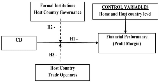 By considering the hierarchy in the institutional framework, formal institutions can be “enacted to modify, revise, or replace informal constraints” (). By considering the direction of formal institutional distances (FID),  () has shown that the effects of CD tend to increase when foreign subsidiary firms operate in host countries with less developed formal institutions. Therefore, by considering the contextual characteristics of the host country, it is argued that countries with more developed and supportive formal institutions, such as strong governance mechanisms, are more effective in curbing the adverse effects of CD.
