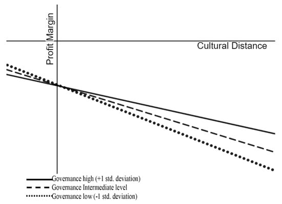 The negative and statistically significant effect of cultural distance (CD_KS) for all empirical arrangements show that the cultural distance negatively affects the financial performance of firms in Latin America (Table 1), supporting hypothesis H1. Furthermore, results reveal that host country governance has a positive and significant direct effect on the financial performance of foreign subsidiary firms. Moreover, the results support hypothesis H2 as the strength of governance in the host country negatively moderates the effects of CD. The decrease in the coefficient of the main relation (between CD_KS and financial performance) verifies the negative moderation. It changes from statistically significant −1.033 (p-value < 0.01) at low governance levels (−1 std. deviation) to −0.806 (p-value < 0.01) at moderate levels and the effects become even lower (−0.578 and p-value < 0.05) when host country governance becomes stronger (+1 std. deviation). Figure 2 shows the change in the slope of the regression line that represents the effects of CD on the profit margin of foreign subsidiaries firms when the quality of governance in the host country improves (solid line, +1 std. deviation) and worsens (dotted line, −1 std. deviation).