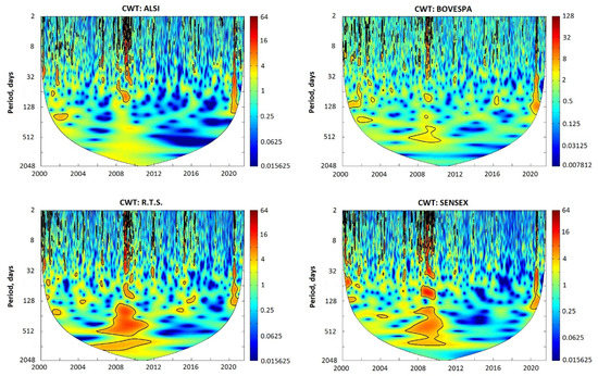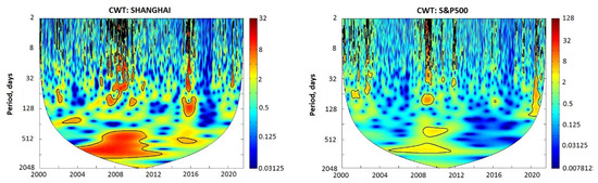The continuous wavelet transform is the absolute square value, which computes the variance of the return series at each time and scale. It shows how volatility for the selected return series evolves in time-frequency space. The wavelet power spectrum (WPS) of each return series is displayed in Figure 1.