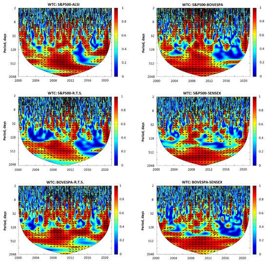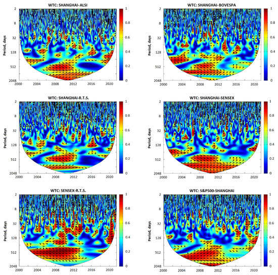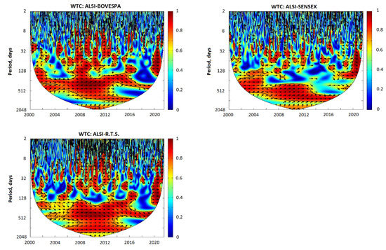 In this section, contagion and lead–lag relationships between BRICS and the US stock return are investigated using the plots of wavelet squared coherence (WSC). For contagion testing, the current study describes contagion as a momentarily (short-lived) increase in comovement immediately after a crisis. Such a description suggests the following. Contagion is any increasing comovement below 256 days. In the coherence plots, contagion is revealed by high coherence areas during some crisis periods. WSC plots (Figure 2, Figure 3 and Figure 4) are similar to those shown in Figure 1. The horizontal axis denotes time units in years, whereas the vertical axis represents the frequency in days. The warmer (red colour) regions illustrate that the two return series are highly dependent. In contrast, the cooler (blue colour) areas indicate that the two return series are less independent. The lead–lag relationship is detected through different investment horizons through arrows pointing in various directions. For example, to retrieve the relative phase relationship from the plot SHANGHAI-ALSI, the following holds in connection with the direction pointing arrows: Right: in-phase (positive association); left: antiphase (negative association); down: SHANGHAI leading ALSI by 90° and up: ALSI leading SHANGHAI by 90°.