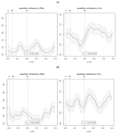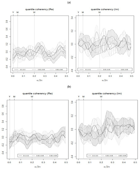 Quantile coherence estimates. (a) BTC vs. USA-EPU. (b) BTC vs. CHN-EPU. Notes: (i) BTC = Bitcoin; CHN_EPU = Chinese economic policy uncertainty index; USA_EPU = USA economic policy uncertainty index. (ii) The plots report the real (left) and unreal (right) parts of the quantile coherency estimates for the different lower, middle, and upper quantiles (0.05|0.05, 0.5|0.5, and 0.95|0.95) of the joint distribution across the different frequencies. The daily cycles over the intervals [0, 0.5] are shown on the horizontal axis, whereas the vertical axis measures the co-dependence of two time series. The frequency cycles in the upper label of the horizontal axis show how yearly (Y), monthly (M), and weekly (W) frequencies are connected across the joint-distribution quantiles.
