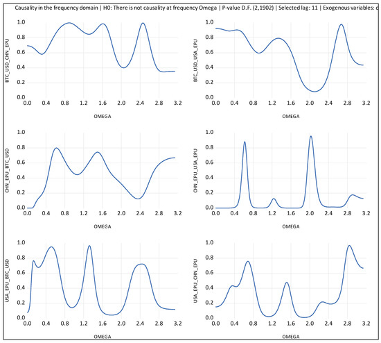 Breitung and Candelon’s (2006) Granger causality test. Notes: (i) BTC = Bitcoin; CHN_EPU = Chinese economic policy uncertainty index; USA_EPU = USA economic policy uncertainty index. (ii) Breitung and Candelon’s (2006) Granger causality test measures the causality in the frequency domain.