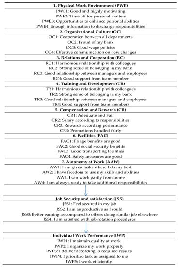 Quality is essential for sustained organizational growth—whether it is service delivery or work life (; ). Accordingly, () argued that QWL has the same impact on sustained organizational growth as the quality of product or service has. They further argued that employers have to recognize that workforces have lives before and after work that must be taken into consideration. Hence, QWL, with its variety of dimensions, is a focal point of our study. Most researches with reference to QWL concentrate on healthcare services (; ; ). Accordingly, studies have mainly focused on QWL factors and their impact on job satisfaction or organizational performance. Among various models, we found Walton’s QWL model (1975). Presented by (), to be quite relevant to our study in measuring the quality of work life. () study offers eight evaluation criteria with 27 QWL sub-criteria, which we consider to be very close to our seven WRKLFQUAL dimensions and 28 subdimensions. There are some studies with reference to the banking system that present relations between job satisfaction and QWL dimensions (; ). With reference to the service industry, () explored the links between performance, profitability, and quality of work life. We believe that job satisfaction relies on QWL, and many researchers have a similar belief—for example (); (); (); (); (); and (). The same is also argued by () with reference to the “perception of Quality of Work-Life and University Goal Attainment”. We also learned from the literature that organizational success greatly relies on employee efforts to improve service quality, and this is consequently achievable with QWL according to employee expectations (). Therefore, we conclude from the above discussion that QWL, job performance, and profitability are significantly linked. Therefore, profitability can by no means be achieved without the required IWP.