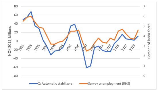 This deficit is furthermore decomposed into a structural and a cyclical component according to a set of algorithms developed by the Ministry of Finance. The cyclical component is supposed to represent the contribution—positive or negative—that is purely due to the cyclical movements in the overall economy and thus not caused by changes in tax rates or entitlement rules. Typically, recessions reduce revenues because incomes fall and increase expenditures on unemployment benefits, and vice versa. These movements are also referred to as automatic stabilizers. We denote this magnitude as