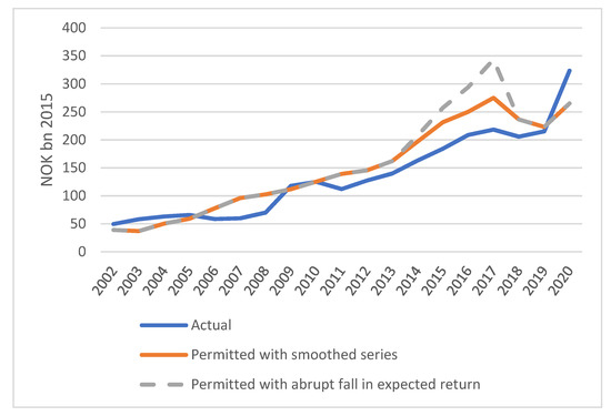 Section 4.2, the fiscal rule itself implies a kind of smoothing in that draws are calibrated to the expected financial return, i.e., as a constant percentage of the fund value, rather than the highly variable percentages implied by the realized returns. The fiscal variables add further smoothing to the extent that the fund value is positively correlated with the domestic business cycle. Even so, the text of the Norwegian fiscal rule allows a third layer of smoothing to avoid large, abrupt changes in the structural, non-oil deficit. We specified a formula for such smoothing in Equation (16).