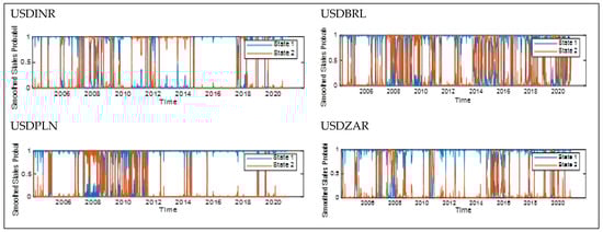Table 3 presents the State 1, or regime 1 (high-risk regime) and state 2, or regime 2 (low-risk regime), with the respective estimated parameters and the transition probabilities. Regime 1 shows some significant parameters for USDBRL and USDINR compared to regime 2. The USDPLN and USDZAR are significant in regime 2 compared to regime 1. The foreign exchange rate against the domestic currency is high in both regimes. The findings show higher transition probabilities in both regimes, with a likely change to shift from a low-risk regime to a high-risk regime and vice versa. The estimated transition probabilities indicate that there is a higher probability that the system stays in the same regime, thus implying few switches in other regimes. The USDBRL, USDINR, USDPLN, and USDZAR results indicate an 89%, 99%, 92%, and 98% probability of remaining in the high-risk regime and a likely change to a lower probability of 11%, 1%, 8%, and 2% switching to the low-risk regime. Alternatively, when the system is in the low-risk regime, there are, respectively, 96%, 98%, 99%, and 90% probabilities of staying in the low-risk regime and, respectively, again likely change of a lower probability of 4%, 2%, 1%, and 10% switching to the high-risk regime. The expected average duration of each regime supports the findings. The expected duration of the high-risk regime for each foreign exchange (USDBRL, USDINR, USDPLN, and USDZAR) has an average duration of 9.23, 87.72, 11.92, and 63.69 days, while the low-risk regime has an average duration of 25.77, 42.37, 67.57, and 10.18 days. Similarly, it implies, for example, that emerging currencies against the USD exchange rate of Brazil will be in a high-risk regime for an average of 9.23 days and a low- risk regime for an average of 25.77 days. This implies that there is a persistence to stay in a low-risk regime for a longer period of time.