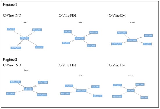 Figure 2 indicates intuitive graphs of the vine structures combining trees and edges corresponding to a specific five-dimensional C-vine copula in the sectors of equity markets, especially industrial, financial, and basic materials in regimes 1 and 2 for the selected developed country (the US) and emerging countries (India, SA, Poland, and Brazil). Each node denotes a margin, representing a pair copula model for two connected nodes, and the label corresponds to the bivariate copula’s type. The presentation of vine-copula is similar to the conventions introduced by (, ).