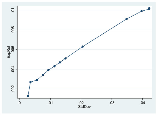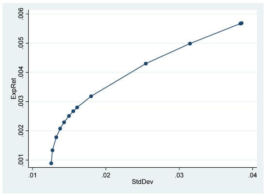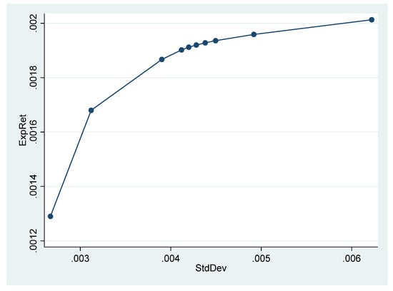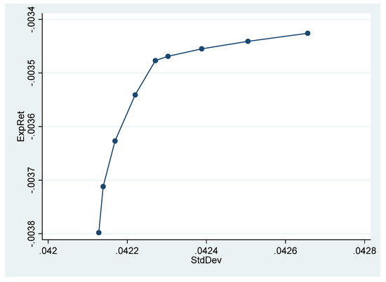 It should indispensably be highlighted that all optimal portfolios with cryptocurrencies are characterized by negative levels of expected returns which are accompanied by high levels of risk. First of all, the Minimum Variance Portfolio indicates expected returns equal to −0.38% and risk measure equal 0.04213. Emphasis should also be given to the result that optimal portfolios with the highest level of risk-aversion do not have many differences as regards returns and volatility from optimal portfolios characterized by risk neutrality or high levels of risk-seeking. To be more precise, when , expected returns take the value of −0.347% and risk equals 0.0423 while the most risky optimal portfolio () displays returns and volatility with values of −0.343 and 0.04266, respectively.