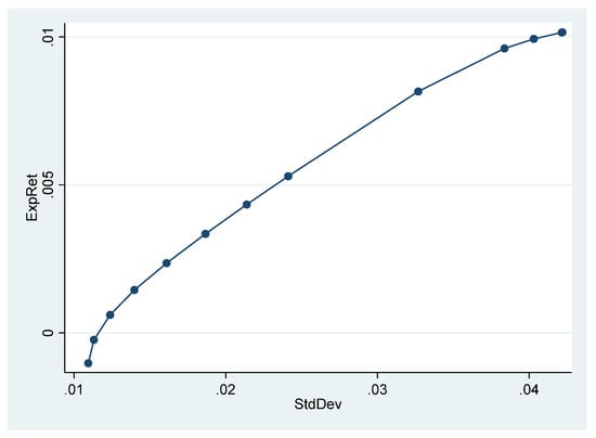 For the purposes of estimating the optimal asset allocation in a portfolio that consists of major national currencies and currencies of countries related to the Russian-Ukrainian conflict, ten national currencies of primary importance and relevance are taken into account. Moreover, portfolio optimization takes place for 13 varying levels of risk-aversion on the part of investors. Figure 1 displays the efficient portfolio derived by conducting optimization procedures based on the Sharpe optimization techniques.
