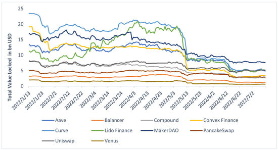 The emergence of DeFi in 2020 has brought with it the possibility of new forms of investment. From a financial perspective, this is positive as DeFi can help diversify and complement traditional portfolios by seeking returns that are independent of traditional asset classes such as equities and bonds, and by reducing overall sensitivity to traditional markets (Yousaf and Yarovaya 2022). In particular, some DeFi protocols offer an automated, low-risk way to generate returns with a “delta-neutral” trading strategy that reduces volatility. On the other hand, DeFi represents a completely new field and therefore requires an unconventional view when measuring performance. It is worth noting that there are no comprehensive studies (robust model-based econometric analyses) in the literature that justify the evaluation of DeFi protocols in the context of some specific metrics of a financial nature. The need for such studies has been highlighted by Kaal et al. (2022) and Brucker (2022), among others. One performance metric that is becoming increasingly popular among DeFi investors is TVL, a cryptocurrency indicator to assess the total value of all assets (funds) deposited in DeFi protocols (TVL can be reported for a single DeFi protocol, but can also be aggregated and reported as a value for all protocols). According to Zmaznev (2021), TVL reflects the financial side of DeFi services and their use and is therefore a suitable metric for assessing DeFi protocols. However, it should be noted that DeFi assets are not homogeneous, but are composed of different classes of contributed funds in DeFi protocols, i.e., they include liquidity pools as well as interest or different types of rewards resulting from the services offered in DeFi protocols, such as loans, stakes, or the aforementioned liquidity pools locked in smart contracts. In terms of stakes, the TVL metric should be interpreted as the amount of assets deposited by liquidity providers in DeFi protocols. Such a metric makes it easier to compare different DeFi protocols to select those that offer the highest returns in terms of annual percentage yields (APYs). Of course, it is not possible to flawlessly rank individual protocols (e.g., based on their TVLs), and therefore the demise of a DeFi protocol that offers high staking premiums while having a high TVL cannot be ruled out. An example of this is the recent quick total failure of Terra (LUNA), which allowed up to 20% APY through stakes. TerraUSD (UST) was a stablecoin hosted by the Terra network that became the second blockchain with the highest TVL after Ethereum in the second quarter of 2022 (Azar et al. 2022).