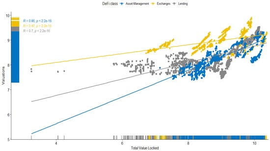Correlations between Valuations and TVLs for 3 different DeFi classes’ protocols. Note: All data logarithmized. Source: own elaboration in R-Studio.