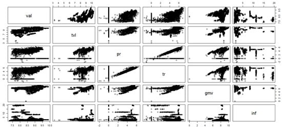As mentioned earlier, for the analysis, we use daily data from the first two quarters of 2022 (between 11 January and 8 July), specifically data on circulating market capitalization (val) (response variable) and the total value locked (tvl) and a whole host of other variables, i.e., protocol revenue (pr), total revenue (tr), gross merchandise volume (gmv), and inflation factor (inf) (explanatory variables) for 30 different DeFi protocols studied (i.e., Uniswap, Synthetix, Loopring, PancakeSwap, Curve, etc.). The study examines the relationships between the data and, in particular, explores how the TVL and the rest of the explanatory variables affect the valuations of these protocols. In other words, the panel regression analysis aims to provide evidence that helps to better understand what drives DeFi valuations in relation to some intrinsic characteristics and informative metrics of the DeFi protocols. We tested all correlation coefficients (for each pair individually) and found that all corresponding p-values were less than 0.05 (see Figure 3 and Figure 4). This is an indication that the correlation estimates between the variables studied are statistically significant. For example, the correlation between the valuation of the DeFi protocols and their respective TVLs is 0.6080682, and this is a statistically significant result (Pearson t-test value = 52.639, df = 4723, p-value < 2.2 × 10−16) (see Figure 3 below). However, it must be taken into account that we are dealing with a time series, so the reliability of such tests is weaker than with cross-sectional data.