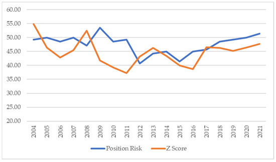 Alternative 2: Z-Score2: In order the check robustness of the results, we complemented the position risk with an alternative risk indicator: the Z-score (; ; ), which is monotonically associated with a measure of a bank’s probability of failure. It is widely used in empirical banking literature ().