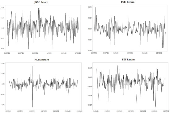 One of the critical indicators in stock investment is the return value (Chu et al. 2017). In each stock market, the return value of the stock price index represents the summary return value of all stocks listed on the stock market (Yunita and Robiyanto 2018). Figure 1 shows the return values of the ASEAN top five stock price indexes.