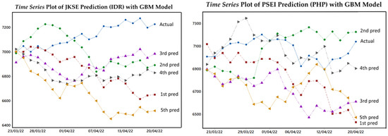 The selection of Δt = 1 day, based on the shortest period of stock price index recording available and the shorter changes in the time used, will help investors find possible price conditions and profits in the near future (Abraham et al. 2018). By inserting the parameter values from Table 5 into Equation (8), the GBM models for each country are: