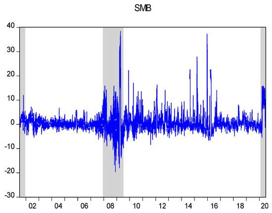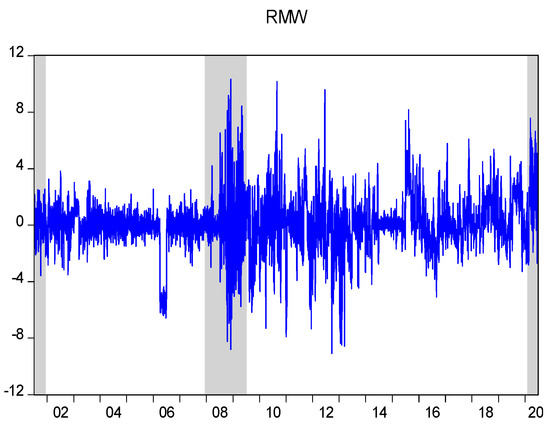 Figure 1, Figure 2, Figure 3, Figure 4 and Figure 510 show the time series variation in all 5 factor premiums, with percentage returns for each factor based portfolio on the vertical axis (Recessionary phases have been shaded in grey). The CMA and WML portfolios seem to be relatively less volatile, while the SMB portfolio seems to have the most returns volatility. This is signified by the standard deviations associated to each of these portfolios. For all factor-based portfolios, returns seem to spike during the recessionary phases, and these seem most pronounced during the 2007/08 crisis and the COVID-19 phase.