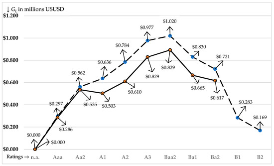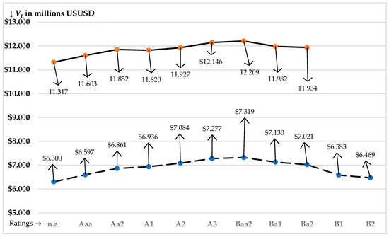 As first defined by Hull (2014), TC1, TE1, and TD1 are the respective unlevered corporate, personal equity, and personal debt tax rates while TC2, TE2, and TD2 are the corresponding levered tax rates that are modified with changes in debt. Since unlevered refers to no debt, the unlevered debt tax rate of TD1 is only used for the practical purpose as a starting point from which the debt tax rate can change once debt is first issued. Because we begin with an unlevered firm and allow tax rates to change when debt increases, Hull argues that TD1 < TD2, TC2 < TC1, and TE2 < TE1 hold. For our tests, each tax rate changes by 0.03 in its predicted direction, which means that the corporate and personal equity tax rates fall, while the personal debt tax rate rises with each increasing debt-for-equity choice. Each of our fifteen increasing debt-for-equity choice corresponds to a fall in the quality for one of the fifteen credit ratings given by Damodaran (2021).