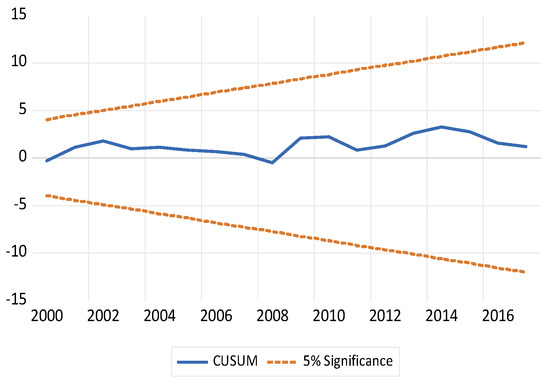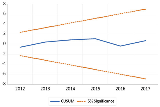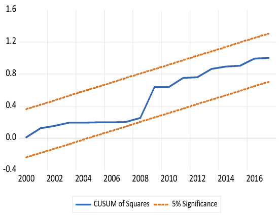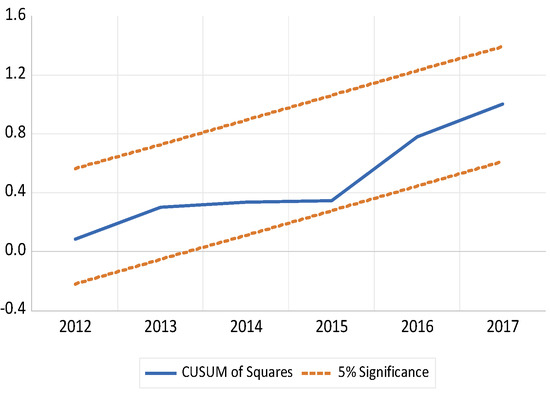 The ARDL regression’s cumulative sums (CUSUM) of the recursive residuals and CUSUM squared plots reveal that the plots are inside the 95% confidence band graphs, indicating that the ARDL models are stable. The CUSUM and CUSUM of squares graphs depicted in Figure 2 and Figure 3 are inside the critical limits and show statistical significance at a level of 5%.
