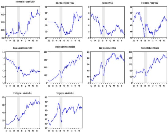 Monthly level data sets on international US dollar values against local Southeast Asian economies were compiled from investing.com (accessed on 1 October 2019) for three time frames. Monthly level data sets for stock indexes of top-performing Southeast Asian economies (ASEAN-5) were incorporated from the country-specific stock market websites of Thailand, Singapore, Philippines, Malaysia, and Indonesia.