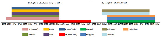 Even though previous studies such as Yildirim (2020) and Kamaludin et al. (2021) examined the integration between major stock markets during the pandemic, the impact of major global markets’ closing prices on ASEAN-5 markets’ opening prices still needs to be explored. King and Wadhwani (1990) argued that the opening prices contain a significant volume of information. Traders at the ASEAN-5 markets may decide on their positions based on the events occurring in the US, UK, or Europe. Therefore, the non-overlapping trading hours between the US and Japan, for instance, provide a clean test of how information is transmitted from one market to another (Lin et al. 1994). The second significant contribution of this study is a better understanding of the stock markets’ reactions before and during the pandemic. These reactions are studied in the context of the relationship between ASEAN-5 with leading world stock markets, an area of research that still needs to be explored. Accordingly, there are two main research questions to consider: Do the closing prices of US, UK, and European stock markets significantly impact the opening prices of ASEAN-5 stock markets? Has the COVID-19 pandemic made a significant difference as a contagion channel between markets? With these contributions in mind, this study aims to investigate the impact of the US, UK, and European stock markets’ closing prices on the opening prices of ASEAN-5 stock markets before and during the COVID-19 pandemic.