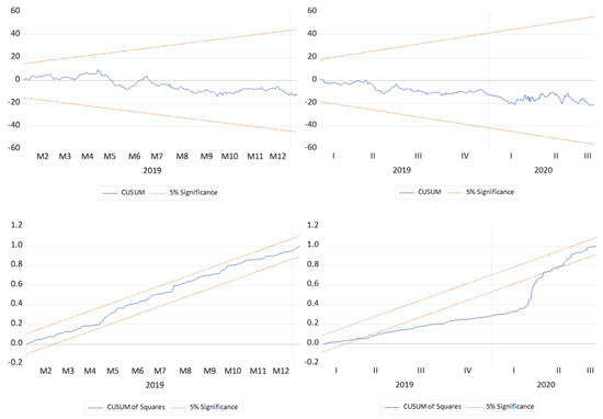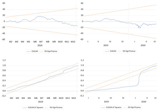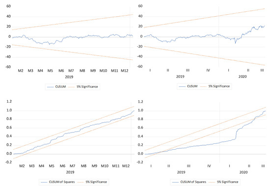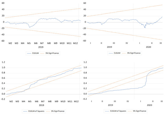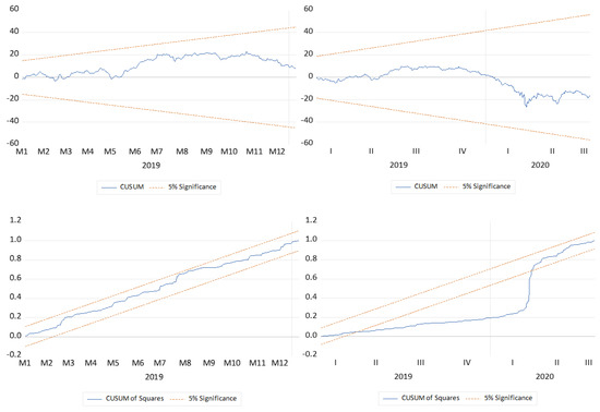Plots of CUSUM and CUSUMSQ for LSETI.O model before (left panel) and during (right panel) COVID-19.