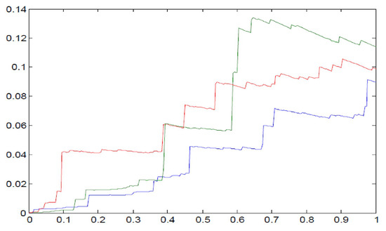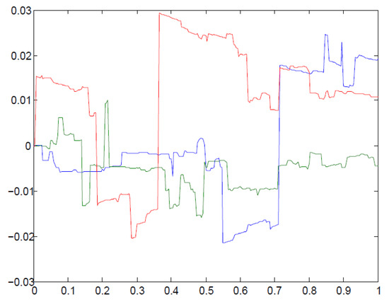 Finally, in Figure 7, we show the trajectories of the correlation process obtained by dividing the covariance process by the product of volatilities from the underlying assets, with a load matrix defined by the angle . Both processes and are generated with the benchmark model parameters. Notice the correlation process exhibits jumps at random times, accounting for the effect of unexpected events.