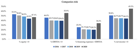 Regarding the net result of the Portuguese restaurant companies, in 2019 there was a profit of EUR 210,229; in 2020, there was a loss of EUR 524,198. In 2020, observing the net income of restaurant companies, 65% of the companies reported a negative net income, 21 p.p. more than in 2019. However, years before, such as 2018, 2017, and 2016, had higher percentages of negative net income (resulting from the previous economic crisis in Europe). Regarding the percentage of negative equity, it is perceived that until 2019 the percentage was reduced; however, with the pandemic crisis, in 2020, the percentage increased. The same scenario occurs for the percentage of companies with negative EBITDA and for companies with financial expenses higher than EBITDA (Figure 1).