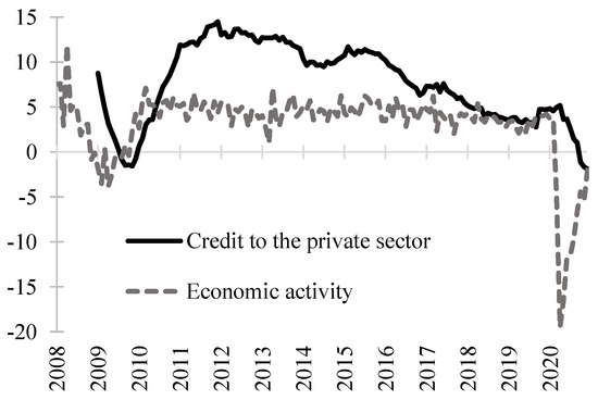 In contrast to the 2009 crisis, the economic crunch of 2020 was far more severe than the fall in private credit (see Figure 1). As mentioned previously, GDP contracted by 7.4%, while private credit fell by only 1.9% year-on-year (hereafter, YOY). This reduction in credit in 2020 was not very different from that registered in the 2009 crisis (−0.8% YOY), when GDP dropped by 0.2%. At first glance, this suggests that the monetary and financial measures implemented had a favorable impact on cushioning the drop in private credit.