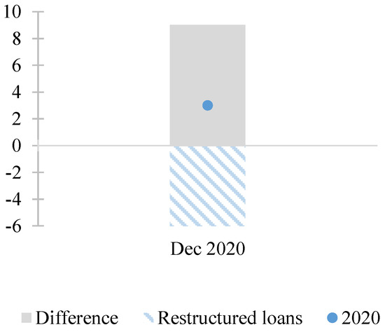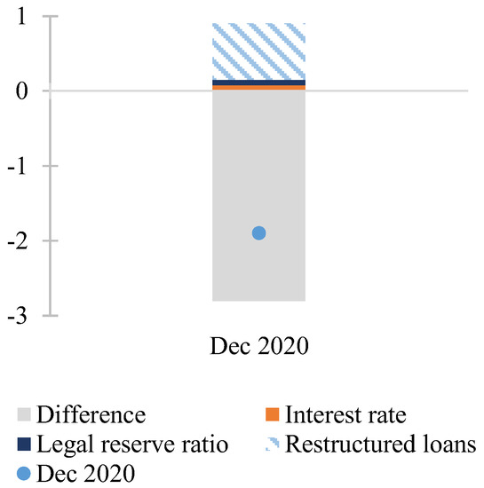 In the case of non-performing loans, economic activity and regulatory easing contributed to reducing the non-performing loans. These results are very similar to those presented before. As with private credit, the more general “regulatory measures” dummy had a greater effect on non-performing loans than the “restructured loans” variable (−6.0 in the blue-striped area in Figure 7 and −8.75 in Figure A2 of Appendix A).