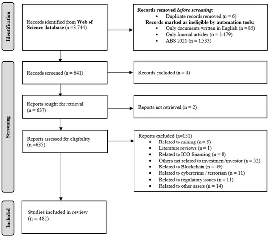 In order to perform the search, we selected the keywords “cryptocurrenc*”, “Bitcoin”, “Portfolio diversification”, “invest*”, and “Alternative investment”. The initial search results returned 3.744 articles. However, we only considered articles that addressed our research objective, that is, the articles needed to address the subject of cryptocurrency as an investment, providing any knowledge that might be of interest from the investment/investor perspective. Additionally, as a quality criterion, we decided to only select journal articles written in English and that belonged to the Academic Journal Guide ABS (Association of Business Schools) list of 2021, regardless of their field of knowledge. With the use of the ABS journal list as a quality criterion, we ensured that the studies included in the review had undergone a rigorous peer review process and were published in reputable journals. This process led to a final sample of 482 articles. Furthermore, the use of more broad keywords in our search enabled the possible contribution of more borderline studies on cryptocurrency investment. In Figure 1, we present our flow of information in addition to the different phases of our systematic review process, which was based on PRISMA (Page et al. 2021). We only used the WoS database since due to the use of the ABS journal guide list as a quality criterion, the articles provided by the Scopus database overlapped too significantly with WoS to be considered in this research.