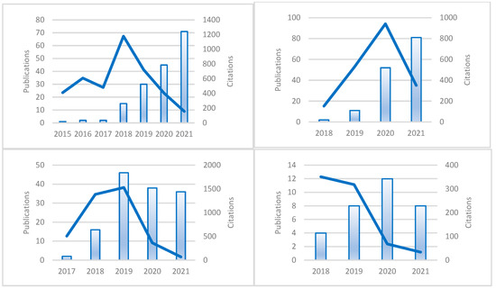 Recent years show a growing interest in this field (Figure 2 and Figure 3), from 1 article published in 2015 to 195 articles in November 2021. The year 2021 delivered 81 and 71 articles in clusters 2 and 1, respectively, and was the most productive year in our dataset. In clusters 3 and 4, the largest contributions were made in 2019 (46) and 2020 (12). These results highlight the growing interest of academia and the novelty of the research field scrutinized herein.