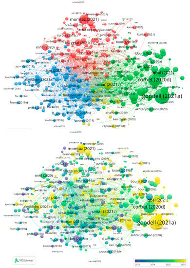 Figure 5 shows that cluster 1 (red), cluster 2 (green), and cluster 3 (blue) express greater numbers of publications and citations. Cluster 4 (yellow) appears to be emerging from the other three clusters. However, until now, 2020 was the year that this cluster received more contributions, pointing toward a deceleration of publications in this theme, which may suggest that researchers and journals are now paying more attention to portfolio diversification, hedge, and safe-haven properties, investor behavior, news effects, and investor-sentiment-related themes. In addition, Figure 5 evidences that there are articles addressing thematics from more than one cluster, revealing that the boundaries between clusters are blurred. This is easily justified by the fact that the literature on cryptocurrency is still young; thus, many references are interconnected.
