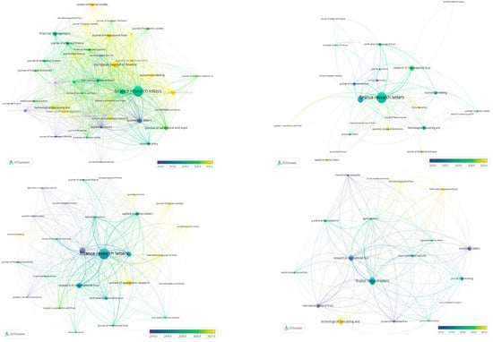 In Table A1 and Figure 6, we show that The Finance Research Letters, Economics Letters, and The International Review of Financial Analysis are the journals with more citations. In addition, the journal Finance Research Letters is present in all clusters and is the most-cited journal in clusters 1 and 2. The journal Economics Letters is the second most-cited journal in our dataset, and this fact remains in cluster 1. In cluster 3, Economics Letters is the most-cited journal. Therefore, it is evidenced that the journal Finance Research Letters contributed more to investor behavior, news effects, investor sentiment, portfolio diversification, hedge, and safe-haven properties. The journal Economics Letters contributed more on cryptocurrency market microstructure and efficiency. Finally, the journal The International Review of Financial Analysis contributed more to volatility and risk management in cryptocurrencies. In addition, Figure 6 shows that of the four clusters, cluster 1 presents the highest structured journal network. It is also shown that the journal with more recent citations in cluster 1 is The European Journal of Finance, in cluster 2 it is Resources Policy, in cluster 3 it is The Annals of Operation Research, and finally, in cluster 4, it is Technological Forecasting and Social Change.