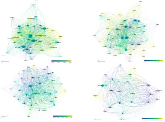 Cluster networks of the most-cited countries by year: cluster 1 (upper left), cluster 2 (upper right), cluster 3 (lower left), and cluster 4 (lower right).