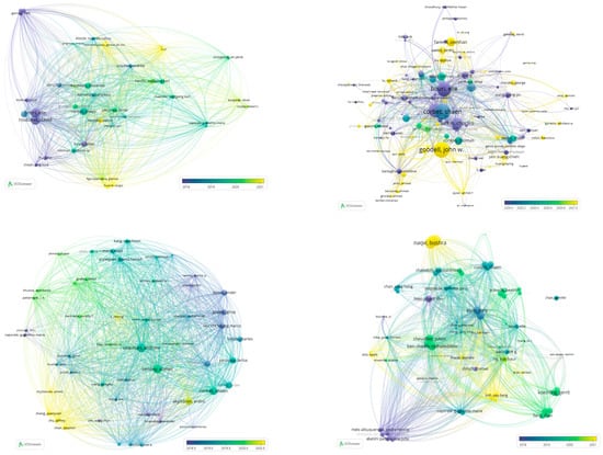 Cluster networks of the most-cited authors by year: cluster 1 (upper left), cluster 2 (upper right), cluster 3 (lower left), and cluster 4 (lower right).