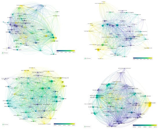 Cluster networks of the most-cited institutions by year: cluster 1 (upper left), cluster 2 (upper right), cluster 3 (lower left), and cluster 4 (lower right).