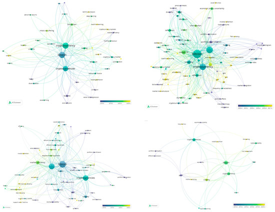 Figure 11 shows the relationship between keywords based on the number of articles in which they occur together. The top three keywords in all clusters are Bitcoin, cryptocurrency, and cryptocurrencies, which is in line with the findings of Jiang et al. (2021) and Jalal et al. (2021). The most recent co-occurrence of keywords in cluster 1 reveals that research is implementing machine learning and technical analysis and is highly concerned with the impact of COVID-19; in cluster 2, research is more concerned with uncertainty, liquidity, and with the COVID-19 impact; in cluster 3, there is the implementation of more support vector machine techniques and a focus on informational efficiency as well as investor attention; in cluster 4, the focus is on analyzing risk management, volatility spillovers, and the implementation of Markov regime switching models.