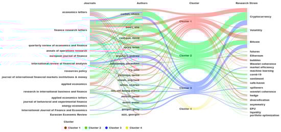 Following Jalal et al. (2021), we identified research streams in the literature. However, instead of using a co-citation analysis, as Alon et al. (2018) and Shonhe (2020), in which the relatedness of the items is determined based on the number of times they are cited together and therefore may change over time very easily, we adopted a bibliographic coupling analysis in which the relatedness of the items is determined based on the number of references they share, which do not change over time (Bartolacci et al. 2020; van Eck and Waltman 2017). We based our research stream on papers from the top 15 authors, resulting in a sample of 90 papers. In Figure 12, we show the relationship of the top 15 authors in our dataset with the most-cited journals, their contributions to the research stream, and consequently, to each cluster. Figure 12 reveals that out of the top 15 authors’ papers, cluster 2 seems to receive the highest flow, followed by cluster 1, cluster 3, and cluster 4. Cluster 1 and cluster 2 contribute to most of the research streams. On the other hand, Cluster 3 seems to contribute more to cryptocurrency, Bitcoin, market efficiency, spillovers, and asymmetry, and Cluster 4 contributes more to volatility, Bitcoin Ethereum, and spillovers. The main research stream are cryptocurrency, Bitcoin, and volatility, as found by Almeida and Gonçalves (2022).