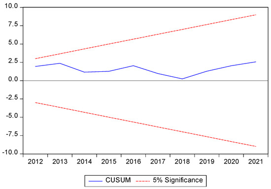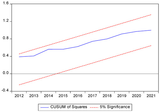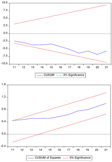 A negative coefficient of (−0.771) and the corresponding statistically significant probability value of (0.000) of ECM imply a short-run association between the study variables of Model 2. The adjusted R2 coefficient value of 0.735, the F-statistic coefficient of 24.592, and the corresponding probability value of (0.000) imply the goodness-of-fit of Model 2. Likewise, a negative coefficient of (−1.422) and a corresponding statistically significant probability value of (0.000) of ECM imply a short-run association between the variables of Model 3. The adjusted R2 coefficient value of 0.935, the F-statistic coefficient of 82.271, and its corresponding probability value of (0.000) imply the goodness-of-fit of Model 3.
