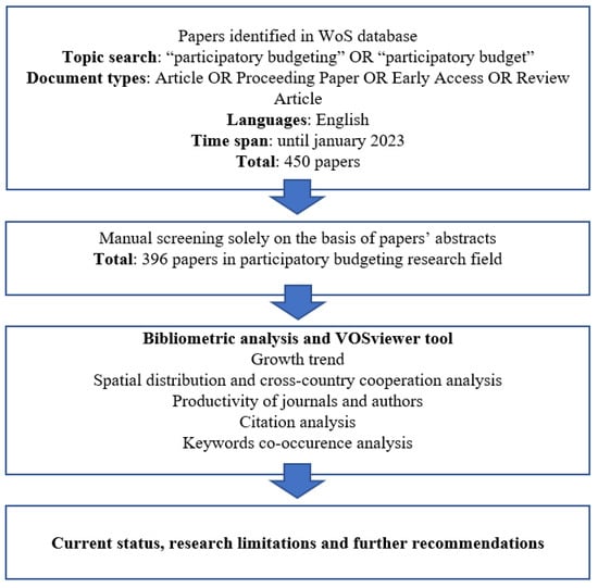 Using the combination of two keywords that are separated by the Boolean “OR” operator (“participatory budgeting” OR “participatory budget”) we identified all possibly relevant papers in WoS database within the PB research topic. The string of keywords was applied in WoS research engine to the publication topic, which includes title, abstract, author keywords, and keywords plus. In addition, the initial search was restricted according to the publication type (Article OR Proceeding Paper OR Early Access OR Review Article) and publication language (we searched exclusively for publications in English language). The explained search inquiry resulted in a total of 450 publications within a time span from 1998 to January 2023.