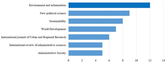 When it comes to the analysis of the productivity of research, we first tested the sample in a quantitative manner. There are no journals that could specifically be isolated as PB “heavens”. Only seven journals indexed in the WoS database have published five or more articles related to PB. Most of them are in the field of “Urban Research”, “Environmental Studies”, or “Public Administration”, as presented in Figure 4.