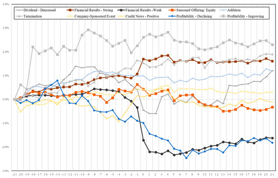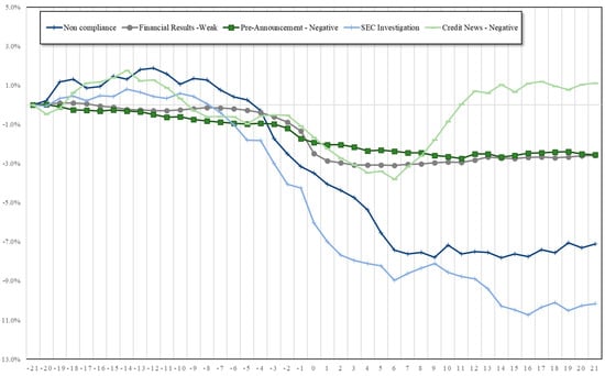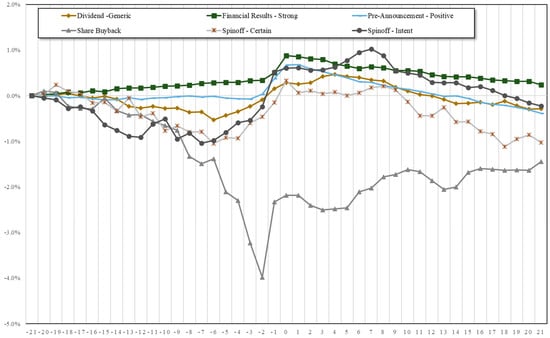 The average abnormal return ) is calculated for each news category across observations and tests to evaluate whether the null hypothesis (H0: = 0) is violated. The event window was kept to seven days (−1 to +5 days); we are interested in the immediate impact of corporate releases and news articles on stock prices. We also wanted to minimize the possibility of other news being released or published within the same window. However, we will discuss the longer event window in Section 6. The results of the test are presented in the next section.