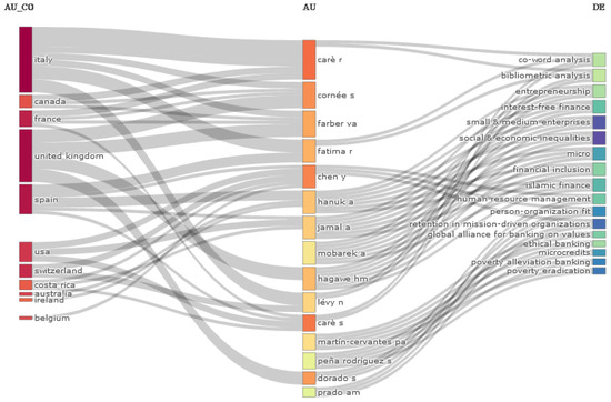 Moreover, the role of ethical banks has been enhanced in the last years as they are trying to address the capital issue facing SMEs by providing specialized loan options that make it simpler for company owners to get cash. For example, social banks in the US provide more than half of the country’s small business loans. In addition, ethical banks are growing all throughout Europe as well, offering SMEs that are founder-led, developing, and on a development trajectory of flexible financing with a personal touch. Thus, the present study’s research question focuses on the financial characteristics of social banks that work with small- and medium-sized businesses. The objective has been raised with the use of bibliometric analysis. Bibliometric analysis is the statistical evaluation of publications such as books, journals, or other works. The productivity and influence of authors or researchers are tracked using analyses. Additionally, bibliometric analysis is used to determine journal impact factors and to comprehend publishing linkages; bibliometrics data may also be visually represented. In order to run a bibliometric analysis, we have retrieved data from the database of Scopus and analyzed and visualized them with the use of the R statistical programming language. The Sankey diagram, which has been developed with the use of RStudio, illustrates the crucial concepts of sustainability in finance and the need of small and medium enterprises for sustainable and green funding from the social banking sector (Figure 1).
