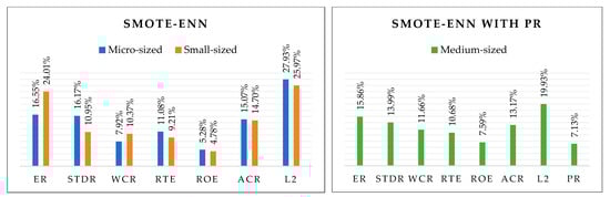 Furthermore, the models achieve significantly better results based on the SMOTE-ENN (see Table 6). For each model, the accuracy increases by more than 20%. The number of observations after oversampling for each technique is reported in Table 3 to capture how many of the observations are deleted from ENN as part of the data-cleaning process. It is clear that SMOTE-ENN deleted significantly more entries for each dataset. This could be the reason for better prediction and higher accuracy because deleting the observations makes it easier for ML models to learn the classification boundaries. Moreover, the provisioning rate (PR), as another feature, was calculated and combined with the best-performing oversampling strategy (SMOTE-ENN) to improve the model’s performance. But this could only improve the forecasting quality of medium-sized companies with LR and XGBoost models. The reason for this could be the increasing impact of the provisioning rate depending on the business size (). For smaller companies, the PR and, consequently, its impact on the financial situation of the company are lower.