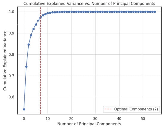 We chose the optimal number of principal components based on the cumulative-explained variance ratio. Specifically, we chose a threshold of 95% explained variance and selected the number of components that crossed that threshold. Based on Figure 1, the optimal number of components to retain is 7 components.