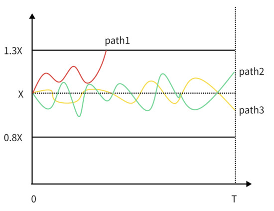 Figure 2 and Figure 3 are drawn as the pricing situation in the simulation path, and path1 represents the path where early redemption occurs. path2 and path3 represent the path of in-price and out-of-price American options.