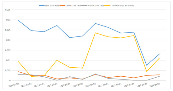 Table 11 and Figure 19 show the pricing error rate of the four models, and the best pricing effect is the two deep learning models. From the perspective of the mean error rate, the pricing effect of WGAN (0.10%) is better than that of LSTM (0.13%), and the pricing effect of LSM’s improved model (−0.98%) is better than that of the traditional LSM model (−2.26%).