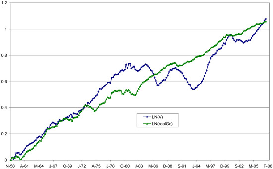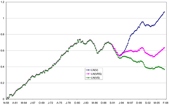 I test the long-term optimal velocity of money relations (2) for the U.S. on a quarterly basis over the period Jan. 1959–Oct. 2007.16 The variables used are real GDP per-capita calculated using real GDP (GDPC96; 2005 dollars, seasonally adjusted annual rate) from BEA and U.S. population monthly data (POP) from the Census Bureau that is matched with real GDP observations on a quarterly basis. Long-term interest rates are monthly rates based on the long-term bond series (LTGOVTBD) from the Fed’s BOG, which is the unweighted average yield on all outstanding bonds neither due nor callable in less than 10 years. The series ends in June 2000. I complete the long-term bond series by using the constant maturity (monthly) 10-year Treasury yield (GS10) from Q3 2000 to Q4 2007. For the short-term interest rate, I use the 3-month T-bill rate (TB3MS) over the same period. I use three alternate money stock measures related to M1. The first measure is M1 from the Fed’s BOG (M1SL), which is monthly and seasonally adjusted data. The other two measures, M1RS and M1S, are available on a seasonally adjusted basis. This data were obtained from Cynamon, Dutkowsky, and Jones’s website at http://www.sweepmeasures.com/ (accessed on 29 October 2009).17